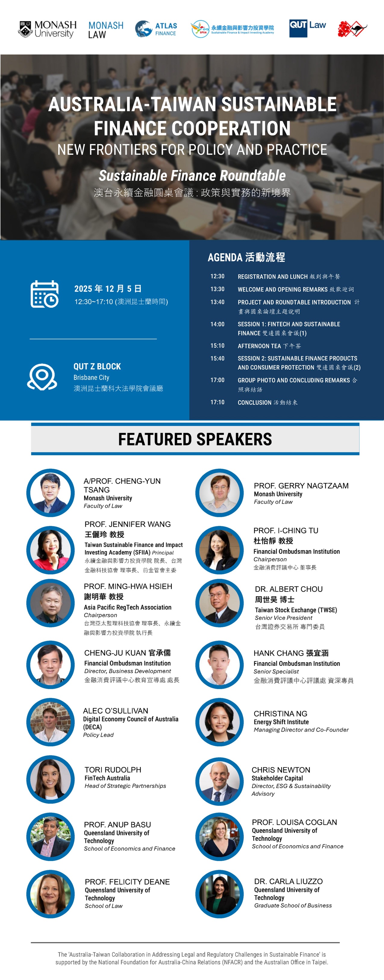 科技變革正在重塑金融體系中永續金融與消費者保護的交匯,為確保永續金融能保持透明、包容與韌性,主管監管機關及金融機構面臨著新的挑戰。為探索這些新境界,由政治大學法學院科技變革與金融創新研究中心(FINTEC)客座研究員澳洲蒙納許大學法學院臧正運副教授所主持的澳台永續金融合作計畫,將於2025年12月5日於澳洲布里斯本舉辦年度高峰會議,會議邀請到前金管會主委王儷玲教授、台灣金融消費評議中心董事長杜怡靜教授等台澳二地16位產官學界專家學者,共同探討科技創新、永續金融與金融消費者保護的交互發展與政策建言。